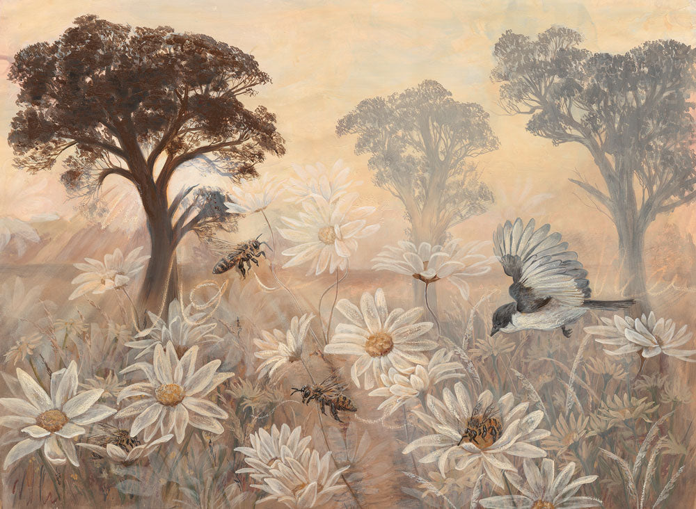 Tammi de Rooy is an Australian muralist and oil painter known for her meditative, detailed representations of the natural environment. Working primarily in a rich, earthy colour palette, her art captures the quiet, spiritual beauty of nature—particularly landscapes and wildflowers at dawn. Her work reflects a deep emotional connection to the land, often focusing on the symbolic and contemplative aspects of sunrise as it plays across trees, flowers, and open countryside.